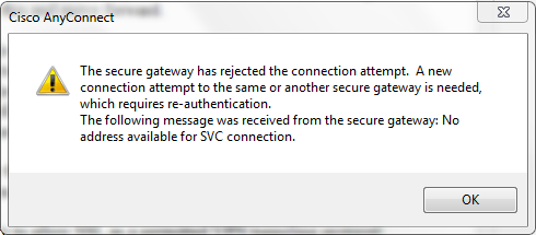 This time asa is more than helpful and directly says that it cannot assign an IP address to SVC connection. Sure, if you want to connect you need an IP address. So let's instruct ASA how to assign IP addresses. This time we will also use default configuration - tunnel-group DefaultWEBVPNGroup.