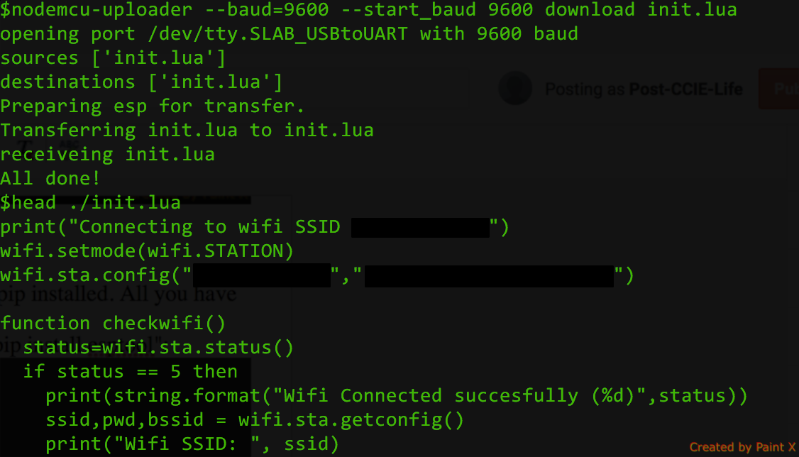 So yea, one last thing to learn would be how to up(down)load files. Need another cool tool to be installed - nodemcu-uploader. Procedure exactly the same as before. Note, disconnect your terminal and according to instructions, as we use old firmware, change baudrate to 9600.