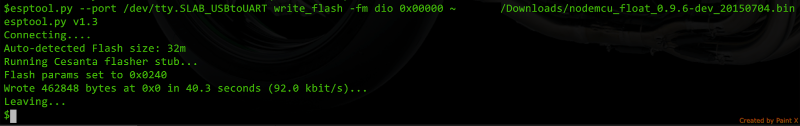 After that just replug your device, open back terminal emulator and reconnect to serial interface. You are back in the business. What is also quite interesting, after flashing on Windows I had to upload init.lua again, this time it was not removed.