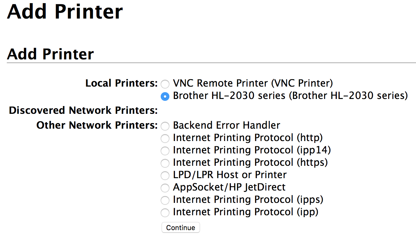 Okay, looks like the hardest part is done. Now click on "Add Printer", then select your Brother HL-2032 printer and click "Continue".